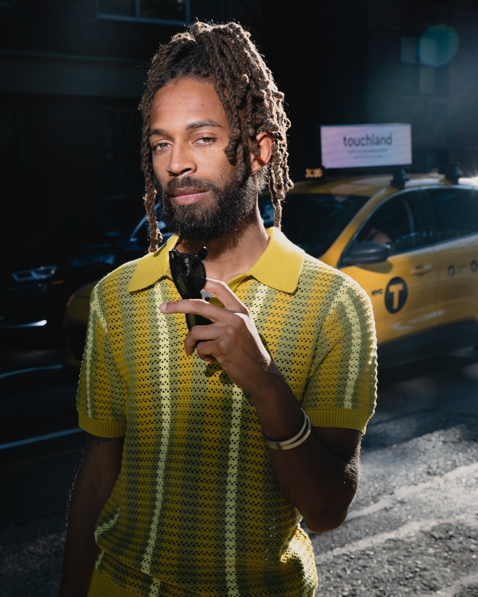 A man with dreadlocks and a beard standing outside at night, holding sunglasses near his face, with a yellow taxi and a illuminated sign in the background.